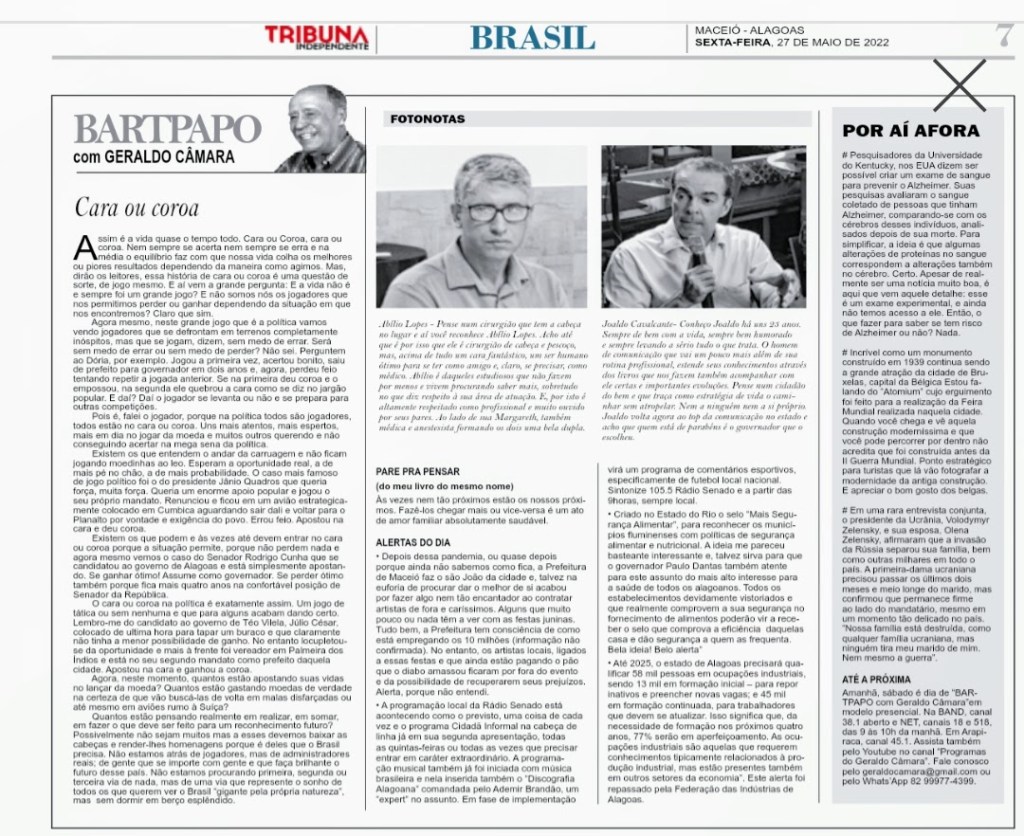 Coluna BARTPAPO – Tribuna Independente – 27-05-2022 – Geraldo Câmara