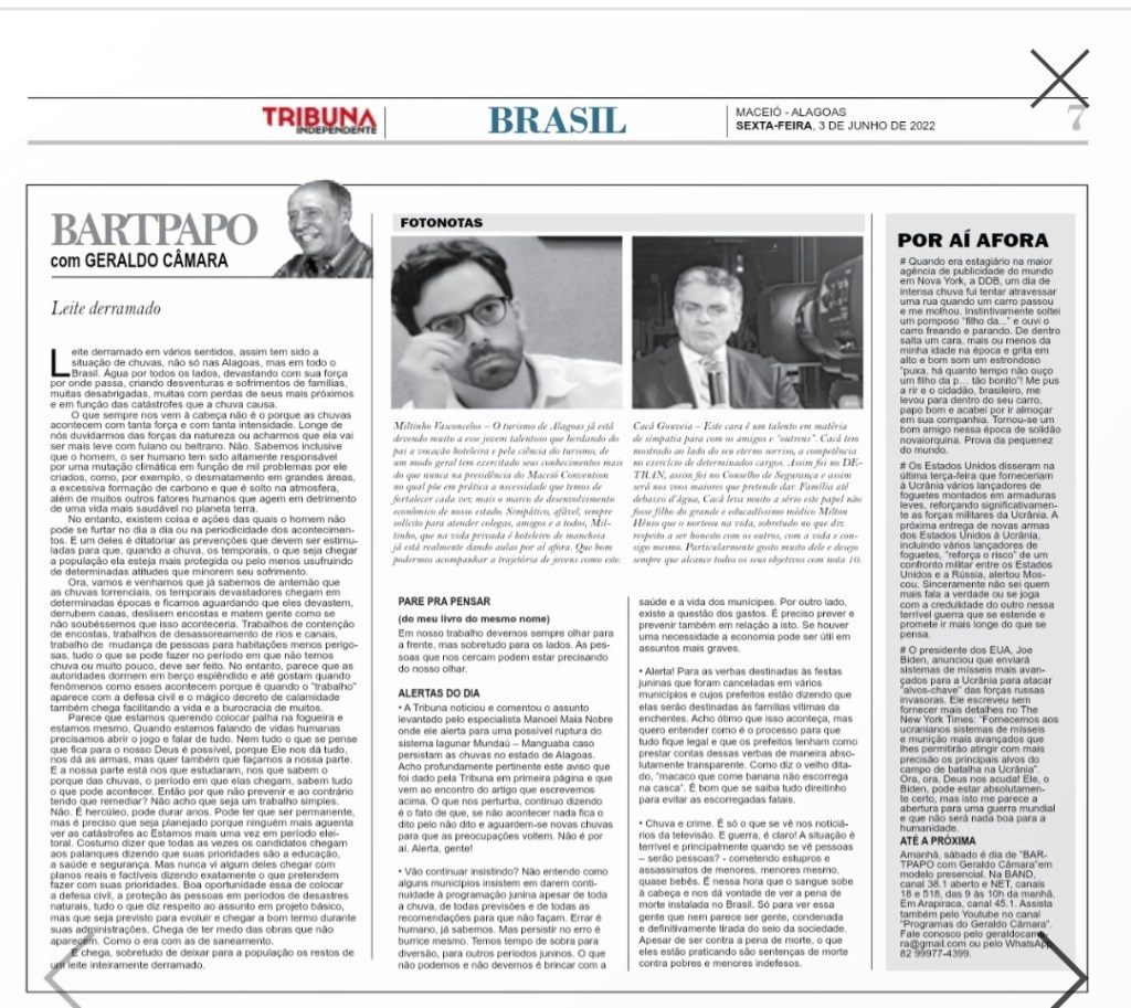 Coluna BARTPAPO – Tribuna Independente – 03-06-2022 – Geraldo Câmara