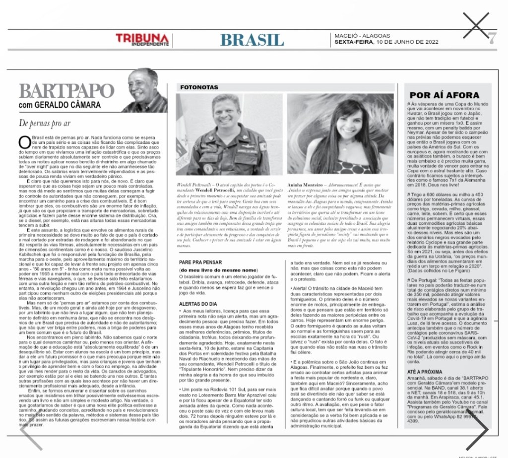Coluna BARTPAPO – Tribuna Independente – 10-06-2022 – Geraldo Câmara