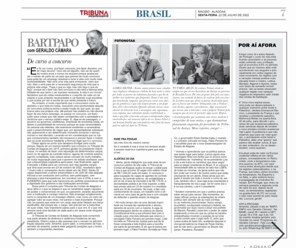 Coluna BARTPAPO com Geraldo Câmara -Tribuna Independente–22-07-2022